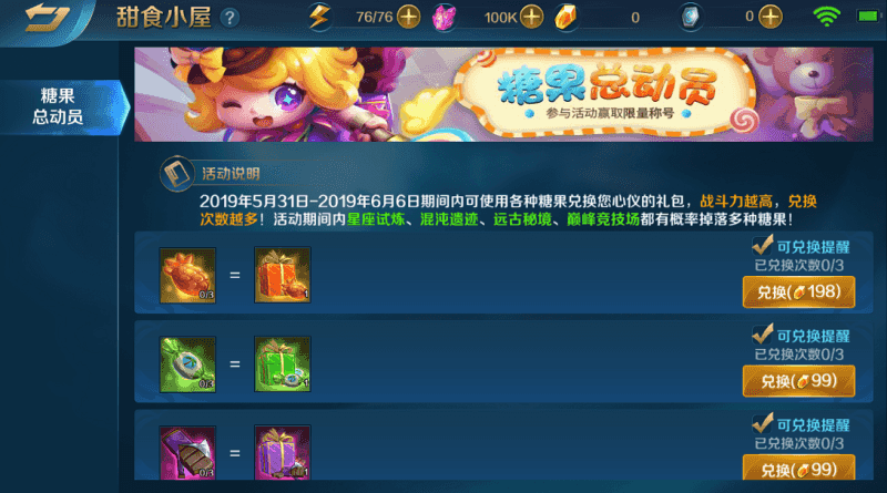 5月31日-6月6日,通过星座试炼、混沌遗迹、远古秘境、巅峰竞技场等玩法都有概率掉落多种糖果,使用糖果即可兑换您心仪的礼包奖励。