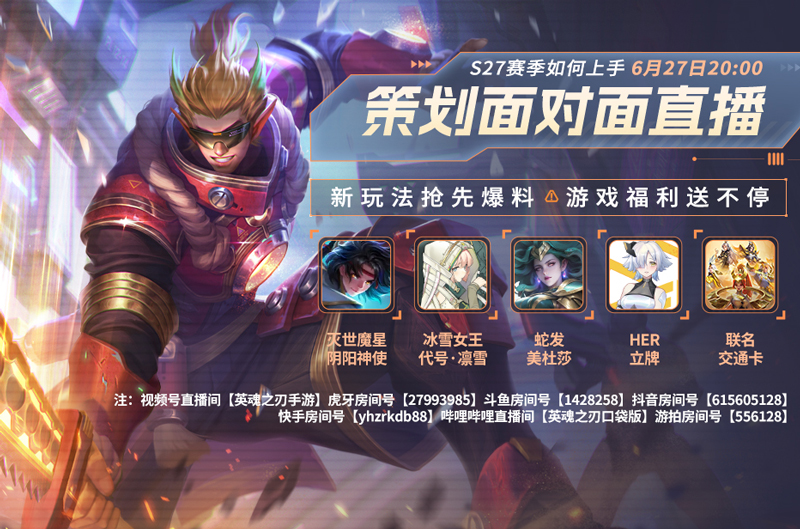 4、英雄平衡性调整——灭世魔星、量子博士、火舞歌灵、九尾天狐等玩家们关心的英雄都在S27新赛季得到了调整,策划们将会重点阐述英雄调整理念。各位小伙伴们还希望哪些英雄得到调整呢?可以在直播间积极发弹幕告诉策划们呦!