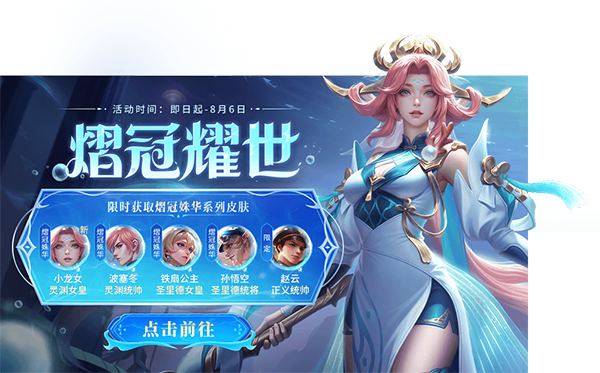 熠冠耀世奖池更新!参与活动可获得女皇币与统帅币,限时获取全新熠冠姝华套系皮肤小龙女-灵渊女皇、波塞冬-灵渊统帅、铁扇公主-圣里德女皇、孙悟空-圣里德统将、圣女贞德-秋墨花灵、曹操-致胜挥击等好礼!参与对战还有概率掉落体验券!