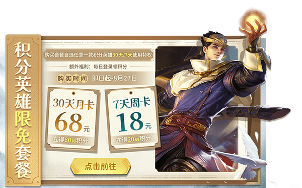 特权内容:①立即获得20w积分;②从3位积分英雄中(鹤道大师、精卫、亚瑟王)自选1款积分英雄,并获得7天限免体验特权;