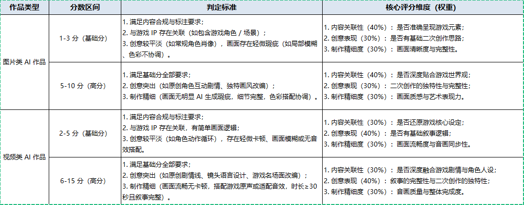 评分将从 “内容关联性”“创意表现”“制作精细度” 三个维度综合判定,具体分数区间与判定依据如下: